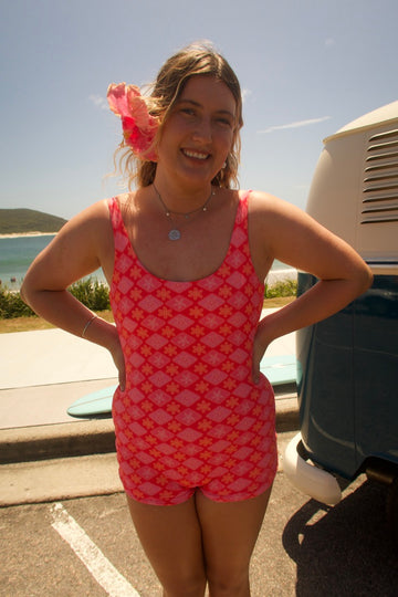 The Delilah Surf Suit is your ultimate companion for ocean adventures, designed for both comfort and performance. This one-piece with boy-leg shorts offers full coverage and freedom of movement, perfect for surfing, swimming, or any water activity. Made from eco-friendly recycled plastics, it’s as sustainable as it is soft, giving you a smooth, comfy fit that moves with you. The low scoop back adds a touch of elegance, while adjustable straps let you tailor the fit for maximum comfort. Removable padding provides customizable support, so you can focus on the waves without a second thought. Whether you're catching the perfect wave or just soaking up the sun, this surf suit has you covered.